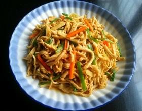 - 5. 爆香葱姜蒜后加入鸡肉丝翻炒一分钟后加入生抽和料酒继续翻炒均匀后盖上盖子用小火再焖1分钟。