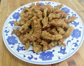 大勺放火上放入适量的油烧热,一条条地放入裹好糊的肉,炸至肉飘起就捞出来