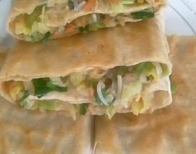锅里铺上煎饼,再把菜均匀的铺在煎饼上