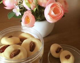 - 5. 把面团搓成一个个的小圆子,轻轻的按扁,再一个个的按入葡萄干或蔓越梅干(注意一定要轻点按,不要把小面饼弄裂了)