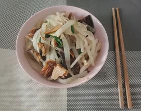 放入萝卜丝,翻炒至熟软