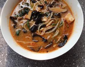 - 5. 水开后放一点浓汤汁。搅动锅里的水,等浓汤汁充分溶解后,放入事先准备好的菠菜,香菇,鱼豆腐,木耳等。因为米线是事先煮好的,等蔬菜什么的快煮熟后放就可以。备注:鱼豆腐,木耳,香菇等不容易熟要先放。或者在郫县豆瓣酱炒出红油时放入,炒一下,在放水也可以。