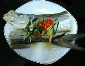 咸鱼放进盘子里,鱼下面放点姜丝,鱼上面放上姜丝,葱段,小米椒