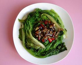把上步的食料放在生菜上,或是把生菜倒入锅内翻炒,均可。