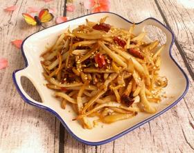 炒锅烧热到油,把包菇丝放入大火编炒,炒制包菇丝干爽 ,微微发焦黄。盛出备用