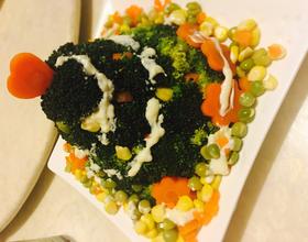 西兰花上放一点豌豆,玉米,胡萝卜,剩下的铺在四周当礼物~再围着弄上沙拉酱就完工了,