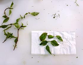 九层塔一片一片的炸,时间在5秒左右。炸好的九层塔放在吸油纸上撒点点盐就可以吃了。