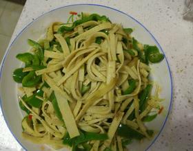 现在开始炒了,等锅烧热,放菜仔油,这里先将切好的青椒倒入锅,因为青椒熟的慢,翻炒几下,加入切好的豆皮,一起翻炒,加入盐,姜,大蒜沫,鸡精,翻炒一会儿,加一勺水,翻炒两下起锅!