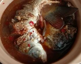 把煎好的鱼放到西红柿上面,放豆瓣酱,酱油醋,鸡精,适量的盐加水慢慢炖开,最后放点葱。