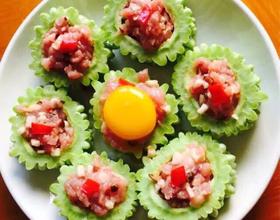 肉末填入苦瓜中心,加辣椒蛋黄等点缀。