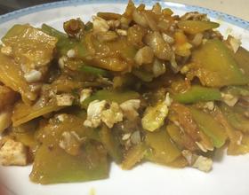 热油下蒜末,煸出香味后放入南瓜翻炒。