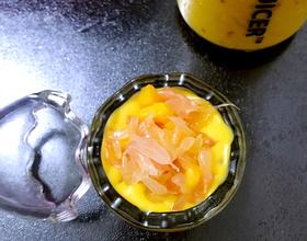西米露、芒果丁、西柚粒倒入芒果椰浆汁中均匀搅拌,入冰箱冷藏