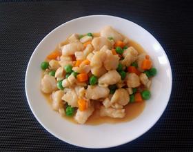 油锅烧热后转小火放入鱼肉丁 这样肉不容易粘在锅中 鱼肉也不容易碎 放入蔬菜后转中火正常炒即可 鱼肉很容易熟 配菜入锅稍煸炒后很快就可以出锅了哦
