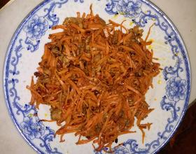 倒油将红萝卜炒熟后,倒入肉丝炒匀