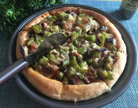 把黄油放入加热的锅内融化,把培根和香肠煎一煎,青椒、洋葱和香菇炒一炒!准备好马苏里拉芝士!