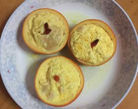 将搅动好的鸡蛋橙子果肉汁倒入橙子壳里,放入笼屉里蒸三或四分钟
