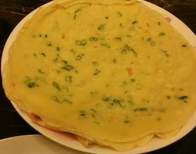 面糊一勺放入锅中,转动锅子,让面糊均匀平铺在锅底