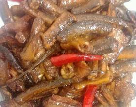 加入鳝鱼煸炒一会放入葱,干辣椒,黄酒,白酒,盐,白糖,加入少许的清水汤快干时加入鸡精