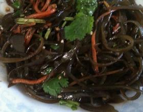 泡发好洗净的海带丝开水煮2分钟,控干水晾凉,加胡萝卜丝、香菜段