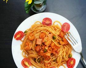 - 8. 把意面放入,倒入番茄酱跟适量盐(不放也可以)