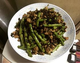 再把煮过的豆角倒下去和肉碎炒至两、三分钟。