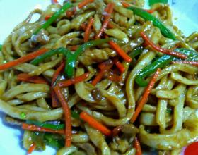 放胡罗卜丝和尖椒丝翻炒均匀,加生抽一大勺,和老抽少许炒均匀。