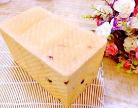 取出一个醒发好的面团,用擀面杖擀成长条状面片,宽度和吐司模的宽度一致,均匀的撒上蔓越莓干(蔓越干提前用刀切碎一点儿)