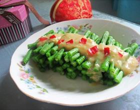焯水并拔凉后的豇豆整齐码放在盘中。