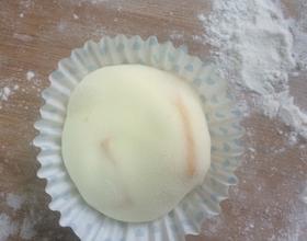 - 4. 十分钟后,把面团从冰箱取出。先取25克的面团擀成面皮,然后把面皮放进小碗,随后在面皮中放入适量的奶油、芒果(自己喜欢的水果或奥利奥)。再包裹、粘粉。最后把成型的雪媚娘放到冷藏室。