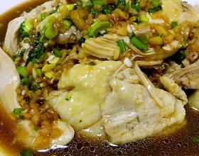 锅中热少许油,放入葱姜蒜爆香,加入酱油,放入煮鸡腿的汤,煮开,放入碗中,放入香菜,葱,搅拌均匀倒入鸡腿中一半
