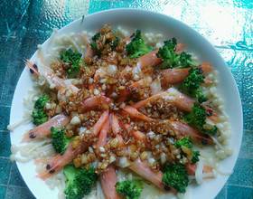 虾整好后放入盘子里,与金针菇一起放入祸中蒸5_6分钟。