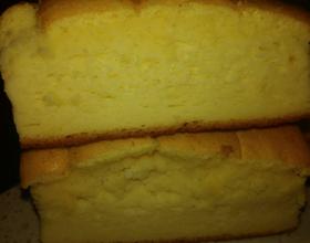 在把剩下的蛋白全部倒入蛋黄糊里搅拌均匀如下图。倒入模具中。烤箱预热150度,10分钟,转160度35分钟。