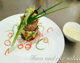 - 5. 盘底放好切好的樱桃萝卜,放上模具,将拌好的沙拉体放入模具内,上面铺上一层捣碎的金枪鱼,用青红椒的细丝、黑橄榄片、香葱、玉兰生菜装饰。
