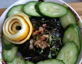 柠檬皮用小刀像削苹果皮样的把皮削下来备用喔,黄瓜斜着切,海带切丝,蒜半压成泥。