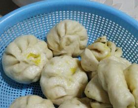 - 5. 面团分小块,搓条切段、压扁成包子皮,包上菜,包子就好了,上屉开蒸。