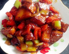 锅内放油烧至冒烟,下土豆块炸成金黄色捞起备用