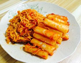 把酱少加水放锅里炒一分钟,加入米糕条和面,炒均匀即可。