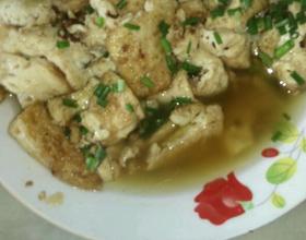 两面都成金黄色之后放盐放生抽拿起锅晃动下,为了让豆腐更入味,之后加水满出豆腐一点