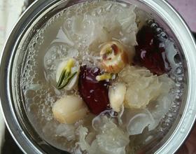 放下适量水,放下泡发好的银耳莲子红枣,开始用锅煮10分钟,再将西米放入其中。煮半个小时后放下冰糖,再煮10分钟。关火后焖10分钟左右,银耳莲子羹就弄好了。