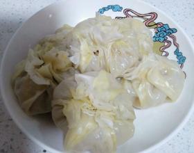 稍麦片可以买现成的,将肉馅用勺子盛放在稍麦皮中间,皮子向中间合拢,不要压死