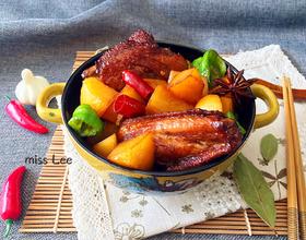 继续盖盖小火焖煮10分钟左右到汤汁减半时,放入土豆块翻匀,盖上盖再焖一会儿;