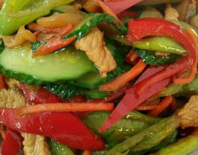 最后放入胡萝卜丝,黄瓜片翻炒几下,放盐味精出锅