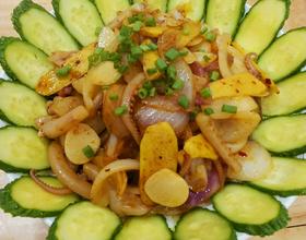放入鱿鱼须,加入料酒,翻炒1分钟后加洋葱,加入盐,辣椒粉,翻炒1分钟即可