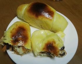 - 5. 搓成红萝卜型 用擀面杖压成30厘米长 在宽一头打竖放馅到三分之二长度停 以宽头卷起(不要压太实 太实面包不成型)