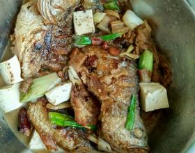 鱼腌制好了可以下锅油炸,炸到金黄捞出。把锅里的油捞出洗干净下油把切好的的大肉片下锅炒至熟。加水,加豆腐块加大料加鱼炖一会在家葱姜。