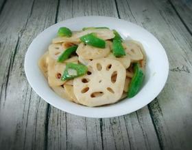 放入青椒翻炒几下,下藕片翻炒均匀。
