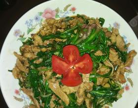 变色肉丝中加葱姜蒜粒,继续翻炒、出肉香,加老抽,酱油,蒲公英翻炒,勾薄芡,出锅