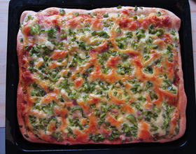 - 12. 将发酵至两倍大的面团取出,用擀面杖擀成烤盘的形状,铺入烤盘;