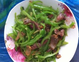 然后下辣椒丝翻炒 (提前把青椒切丝)