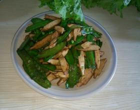 待豌豆格快熟的时候倒入香干加入香辣酱翻炒至熟出锅